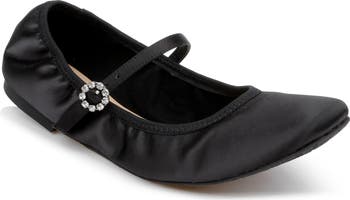 A jewel-encrusted buckle enriches the mary jane strap on a cushioned flat fashioned with a squared-off toe for contemporary appeal.