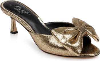A voluminous bow enriches the vamp of a soirée-ready slide sandal grounded by a cushioned footbed and tapered heel.