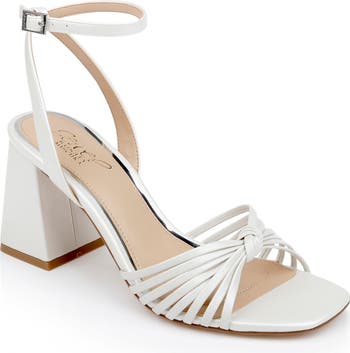 Svelte straps are knotted at the vamp of a stylish ankle-strap sandal balanced by a square toe and flared heel.