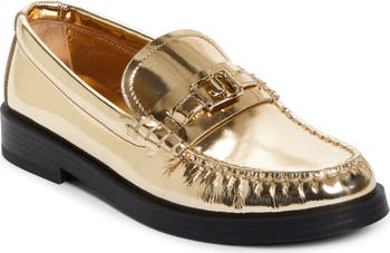 A logo-branded strap authenticates this glossy gilded loafer fashioned from metallic leather and set on a low stacked heel.