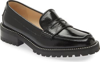 A refined penny loafer made of sheepskin leather injects subtle shine into your look with a high-gloss finish and crystal trim around the lugged sole.