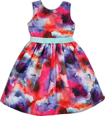 A watercolor print adds a touch of whimsical elegance to this sleeveless, ribbon-trimmed party dress making it a standout for any special occasion.