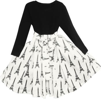 They'll love to twirl in a long-sleeve dress featuring a skirt patterned with Eiffel Tower graphics.