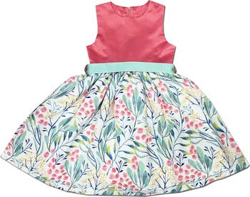 Watercolor blooms sweetly pattern the twirl-worthy skirt of this party dress topped by a shiny satin bodice.