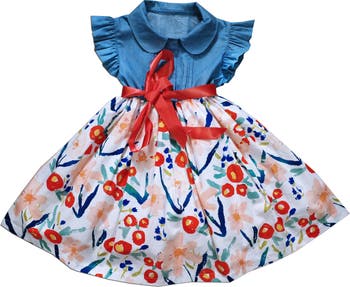 A flutter sleeve and rounded collar offer a soft contrast to the bright, festive floral skirt and bold red ribbon that complete this cotton dress.