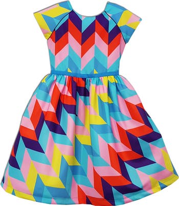 A bold geometric print adds a whimsical finish to a party dress featuring cap sleeves and a ribbon-trim at the waist for an extra dose of sweetness.