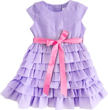 A special occasion dress with a contrasting bow and a tiered skirt offers sweet yet refined style for your little one.