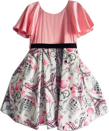 A Parisian print adds a touch of whimsical elegance to this sleeveless, ribbon-trimmed party dress making it a standout for any special occasion.
