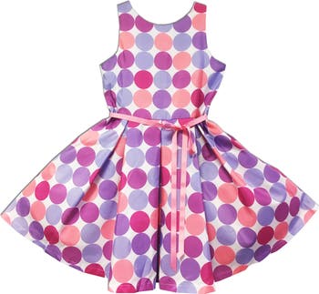A polka dot print adds a whimsical touch to this sleeveless party dress finished with a slender ribbon that makes it a standout for any special occasion.