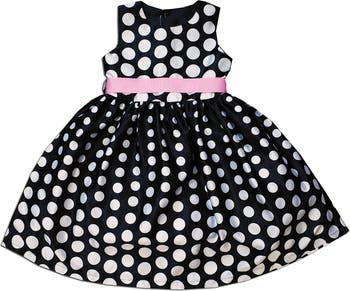 A polka-dot pattern details a special-occasion dress complete with a bow at the waist for an extra dose of sweetness.