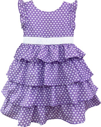 A polka dot heart print adds a whimsical touch to this flutter sleeve party dress finished with a contrast ribbon that makes it a standout for any special occasion.
