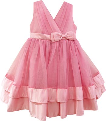 Glossy satin-ribbon trim adds a vintage-inspired finish to a sleeveless party dress finished with a bow-tied ribbon that makes it a standout for any special occasion.