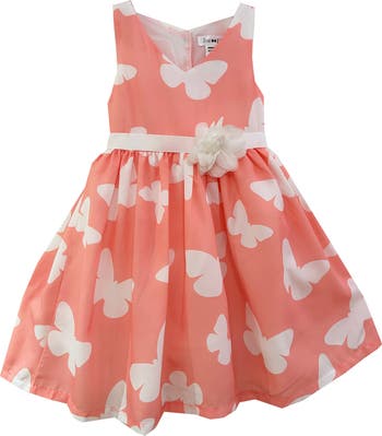 A butterfly print adds a whimsical touch to this sleeveless party dress, finished with a rosette‑trimmed ribbon that makes it a standout for any special occasion.