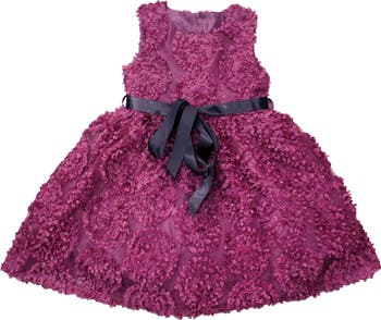 Textured circles add texture and dimension to a special-occasion dress complete with a bow at the waist for an extra dose of sweetness.