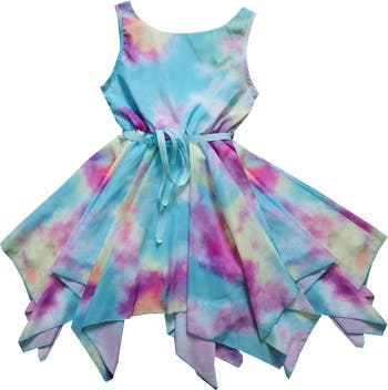 A watercolor print and handkerchief hem adds a whimsical touch to this sleeveless party dress finished with a slender ribbon that makes it a standout for any special occasion.