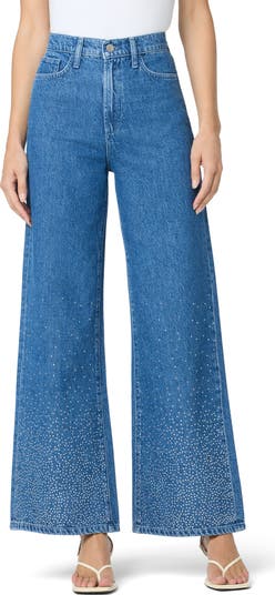 Sparkling crystals cascade to the hems of these retro nonstretch jeans flaunting a high waist and full-length wide legs.