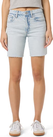 Laid-back and comfortable, these low-stretch denim shorts sport a relaxed Bermuda fit that's chopped with raw, threadbare hems.