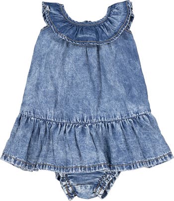 A ruffled neckline and flounce hem define a nonstretch denim dress that's charmingly faded and paired with matching bloomers to keep baby comfy all-day long.