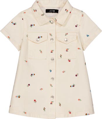 A bright floral print adds sweet appeal to this denim shirt dress that'll take your little trendsetter from school studies to park playdates in cute comfort.