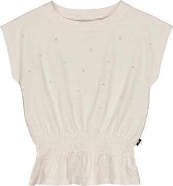 Pearly beads give a graceful sparkle to a charming sleeveless cotton top with gentle smocking through the waist for a look that cool kids will love.