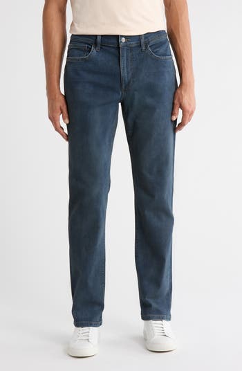 An inky hue with sublte fading lends casual-cool style to slim-cut straight-leg jeans made from shape-retaining stretch denim.