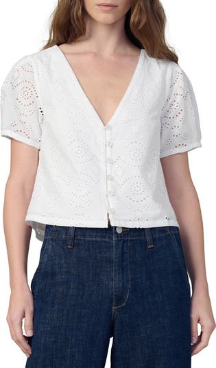 Crisp cotton poplin with delicate eyelet embroidery adds airy country romance to this subtly cropped and boxy top framed by playfully puffed sleeves.