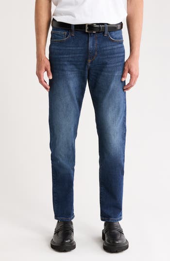 Keep it casual in slim-fitting jeans made from dark-wash stretch denim with lived-in fading.