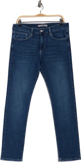 Whiskering and fading enhance the lived-in appeal of these stretchy denim jeans cut in a straight-leg silhouette with a mid-rise fit.