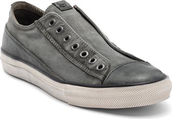 Distressed canvas and glinting hardware lend rustic style to a laceless sneaker that's ready to explore.