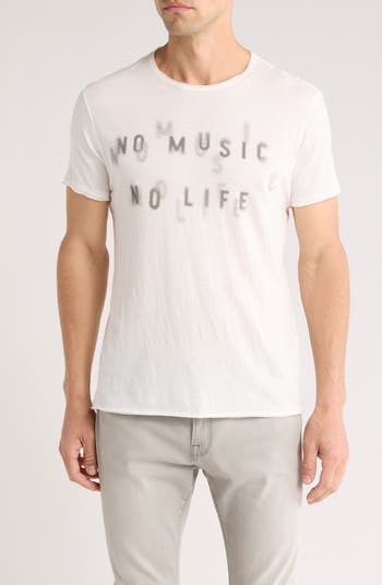 A shadowed message is scattered on the front of this crewneck T-shirt crafted from soft, breathable cotton.