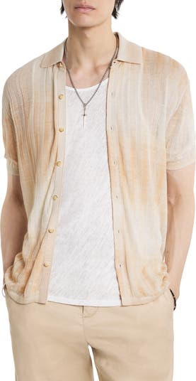 Ombré shading highlights the subtle texture in the linen-enriched yarn of this sweater-shirt with a decidedly casual-cool attitude.