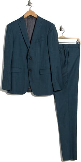 A wool blend crafted with a touch of stretch distinguishes a suit that's tailored in a slim fit and fitted in the waist for a smart, traditional profile. The flat-front trousers feature slightly tapered legs for a modern silhouette that looks crisp and clean in any setting.