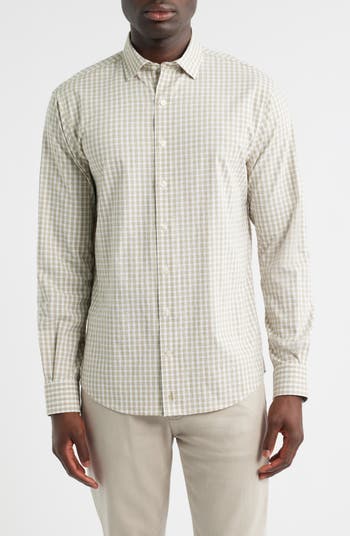 A lightweight performance oxford patterned in a muted plaid keeps you as comfortable as you look in this stretch-enhanced shirt with a relaxed fit that works tucked or untucked.