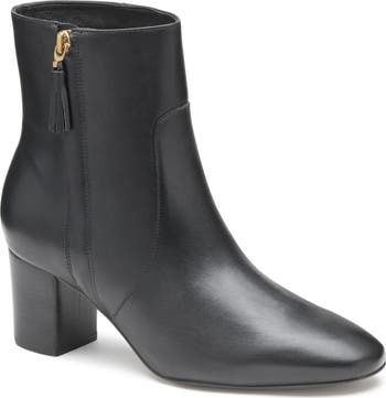 A modest almond toe and stacked block heel frame this calfskin-leather bootie that's complete with a cushioned TRUFOAM footbed.