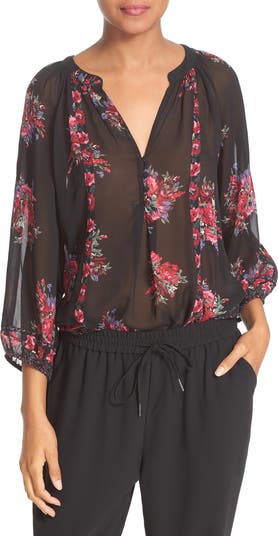 Four dainty buttons close the deeply split neckline of a romantic peasant blouse cast in airy ivory silk strewn with brightly colored bouquets. A banded hem grounds the billowy style.