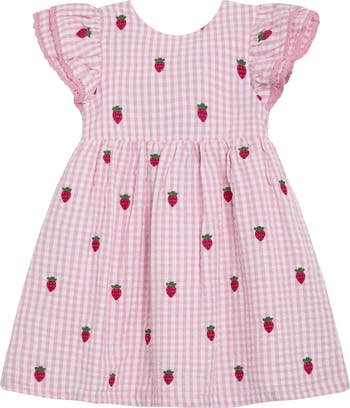 Embroidered strawberries look sweet as summer on a gingham-checked dress made from cool cotton seersucker and framed by double-layer flutter sleeves trimmed with lace.