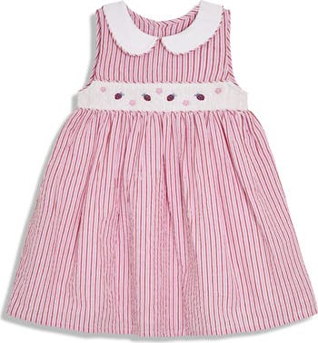 Striped cotton seersucker keeps baby cool on warm days in this sleeveless cotton dress fashioned with a Peter Pan collar and a smocked panel with embroidered ladybugs on the bodice.