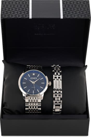 Bring sophisticated style to everyday looks with this set that pairs a classic three-hand bracelet watch with a chain bracelet crafted with watchband links.