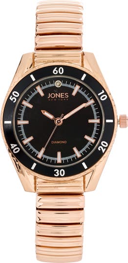 A subtle diamond accent lends refined sparkle to this rose goldtone bracelet watch featuring a rich black sunray dial and sleek expansion band.