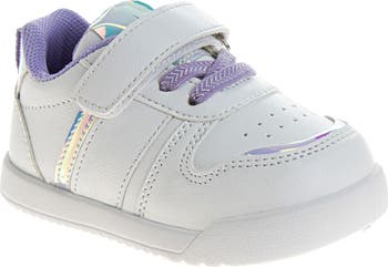Irridescent trims add a little bit of shine to this playground-perfect low-top sneaker secured with flexible elastic laces and a hook-and-loop vamp strap for a secure fit.