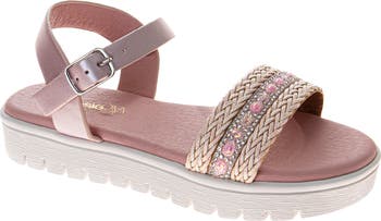Pretty embellishments and a metallic strap lend shimmer and shine to each step they take in this summery sandal built on a grippy rubber sole.