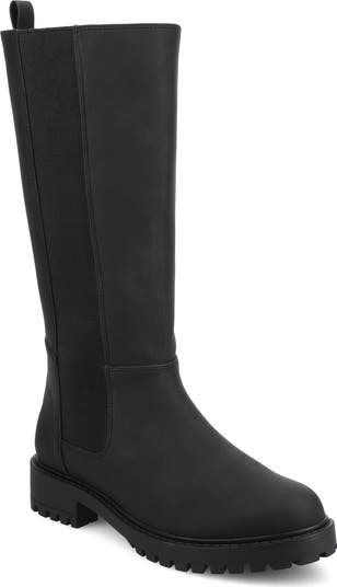 A round toe and lug sole balance a knee-high boot fashioned with a pull-tab, stretchy gore panels and a side zipper for easy entry.