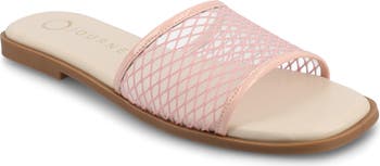 Breeze through sunny days in this latticed mesh slide sandal fashioned with a squared open toe and flat sole.