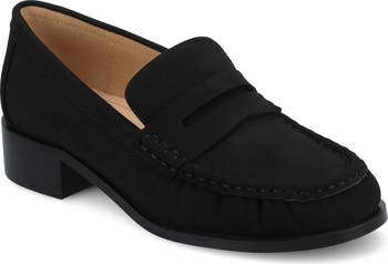 An almond toe and flexible sole balance this loafer-inspired pump lifted by a chunky stacked heel.