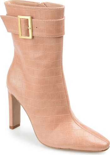 Sophisticated and elegant croc embossment decorates a vegan leather bootie, balanced upon a slim heel and made from vegan leather.