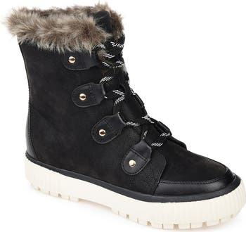 A warm glamping styled boot by Journee Collection featuring cozy faux fur trim and a 4 mm Comfort Foam footbed for ease of step. The Glacier is a round-toe boot detailed with a snug lace-up closure at the shaft, enhanced with goldtone hardware. Made-to-last vegan leather and a treaded outsole finishes the design for maximum performance.
