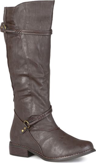 Express your style this season in versatile riding boots by Journee Collection. These boots feature soft faux leather uppers that rise to below the knees with shafts that rise higher in the front. Strappy detail accents the ankles on these fall boots.