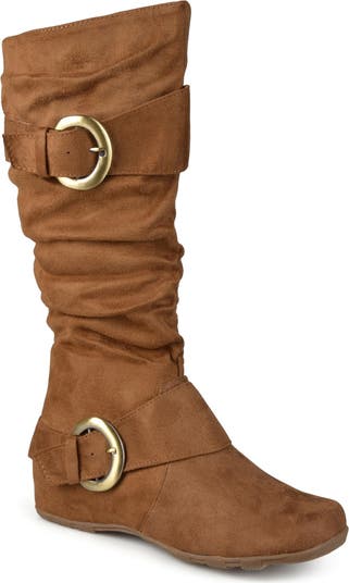 Step into trend-setting style with flat buckle boots by Journee Collection. These must-have winter boots feature smooth faux suede uppers with a subtle slouchy style that rises to a mid-calf height. Sizing: True to size.