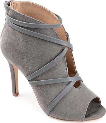 Step into chic style with the open toe bootie by Journee Collection. These shoes feature a soft faux leather design with asymmetrical straps gliding down the shoe. The deep open slit and stiletto heel add gorgeous detail to finish the design.