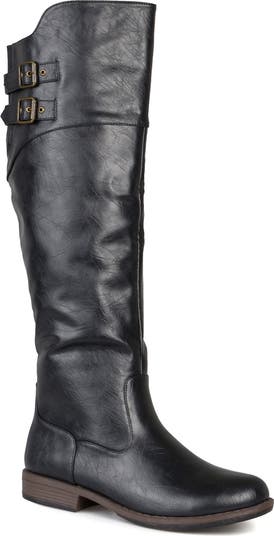 Take on the season in the chicest riding boots this year by Journee Collection. These knee-high boots highlight premium uppers that rise to the knees. Contrasting outsoles and double strap detail with buckle accents completes the look.